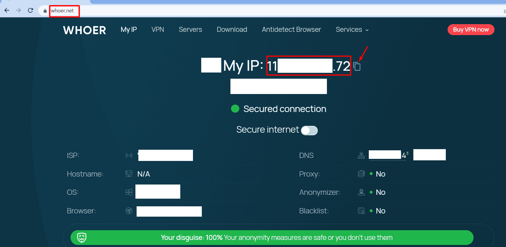 First, visit whoer.net to copy the IP address of your PC