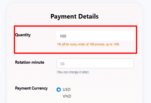 Next, scroll down till you see the Payment Details => put the number of proxies that you want to buy into Quantity section