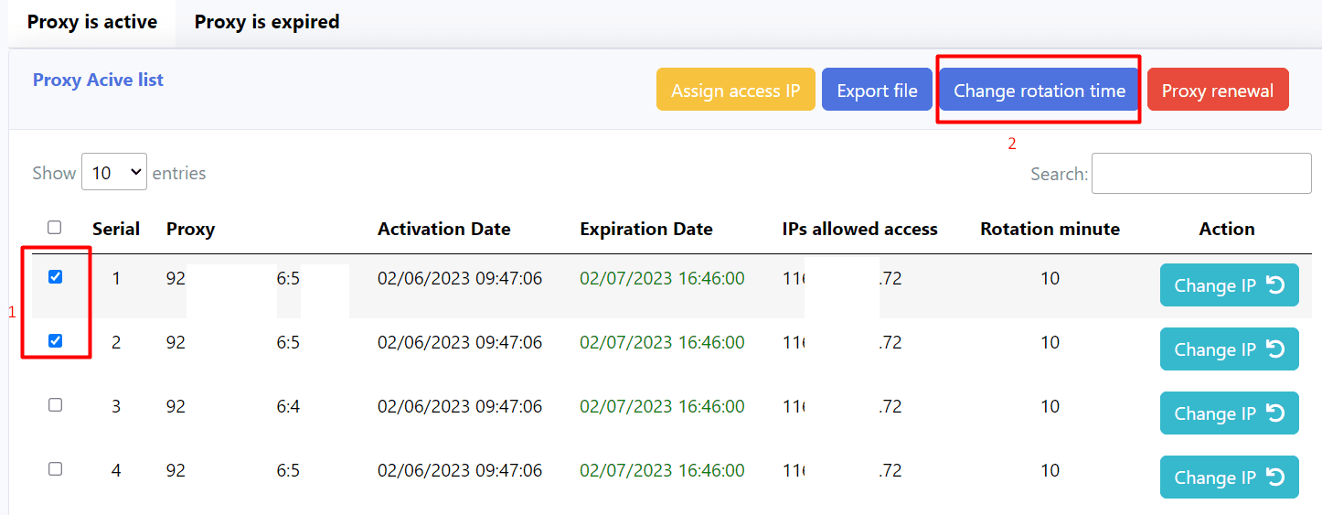 First, you tick on the proxies that you want to change rotation time => click on change rotation time