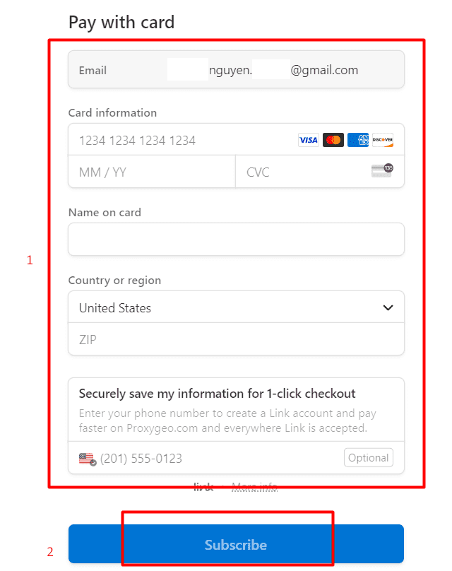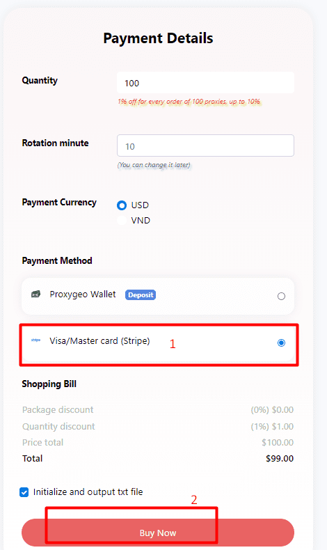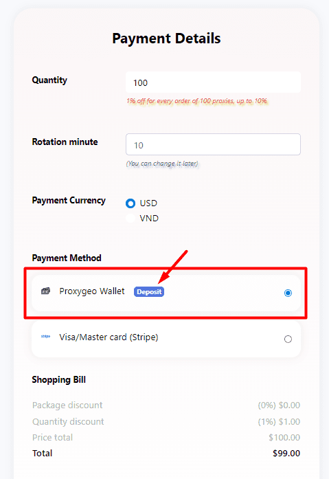 You can pay for the selected proxy packages in 2 ways: Proxygeo wallet or Visa/Master Card