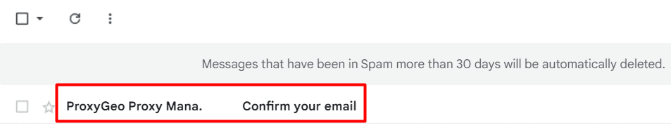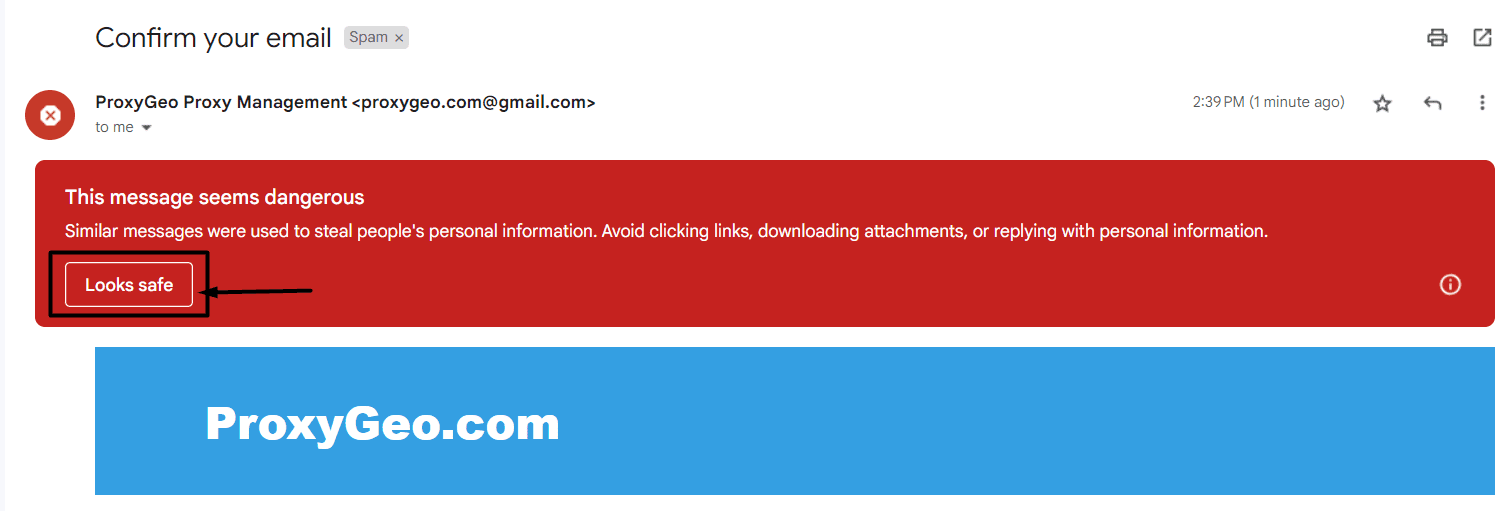 Note: if you do not see the confirmation email in your Inbox, please check your Spam box => click on the received confirmation email => click Look Safe as the following photo => back to your Inbox, you will see the confirmation email from ProxyGeo.
