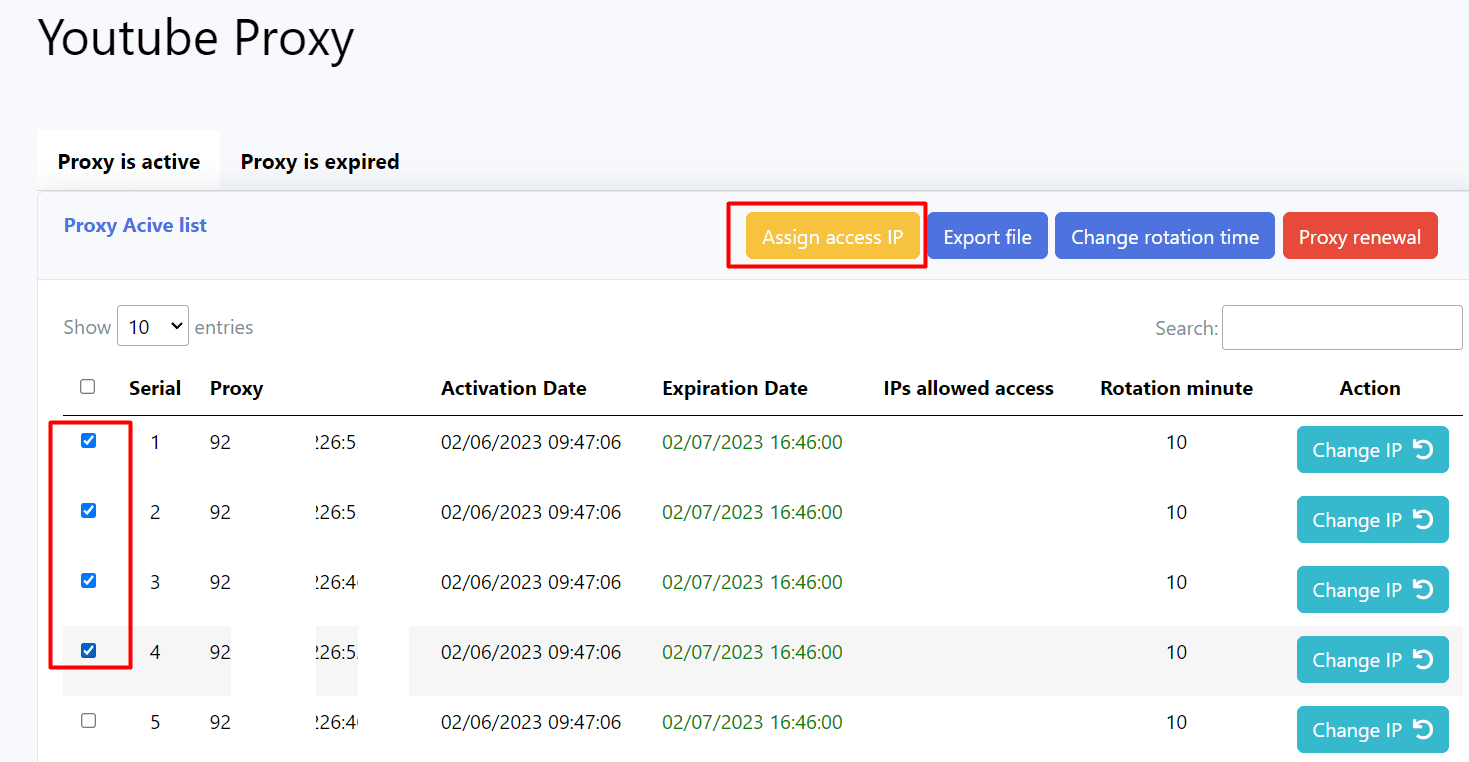 Next, you tick on the proxies that you want to export from your proxy list => click on Assign Access IP