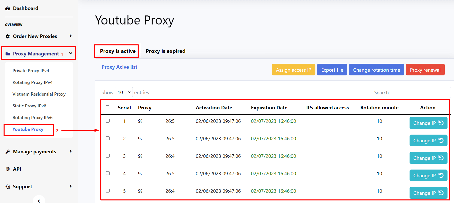 - You can manually change the IP of each proxy every 15 minutes. Click on Change IP button in Action column as the following photo. This action can be applied to 4 types of proxy (Rotating Proxy IPV4, Rotating Proxy IPV6, YouTube Proxy, Vietnam Residential Proxy).