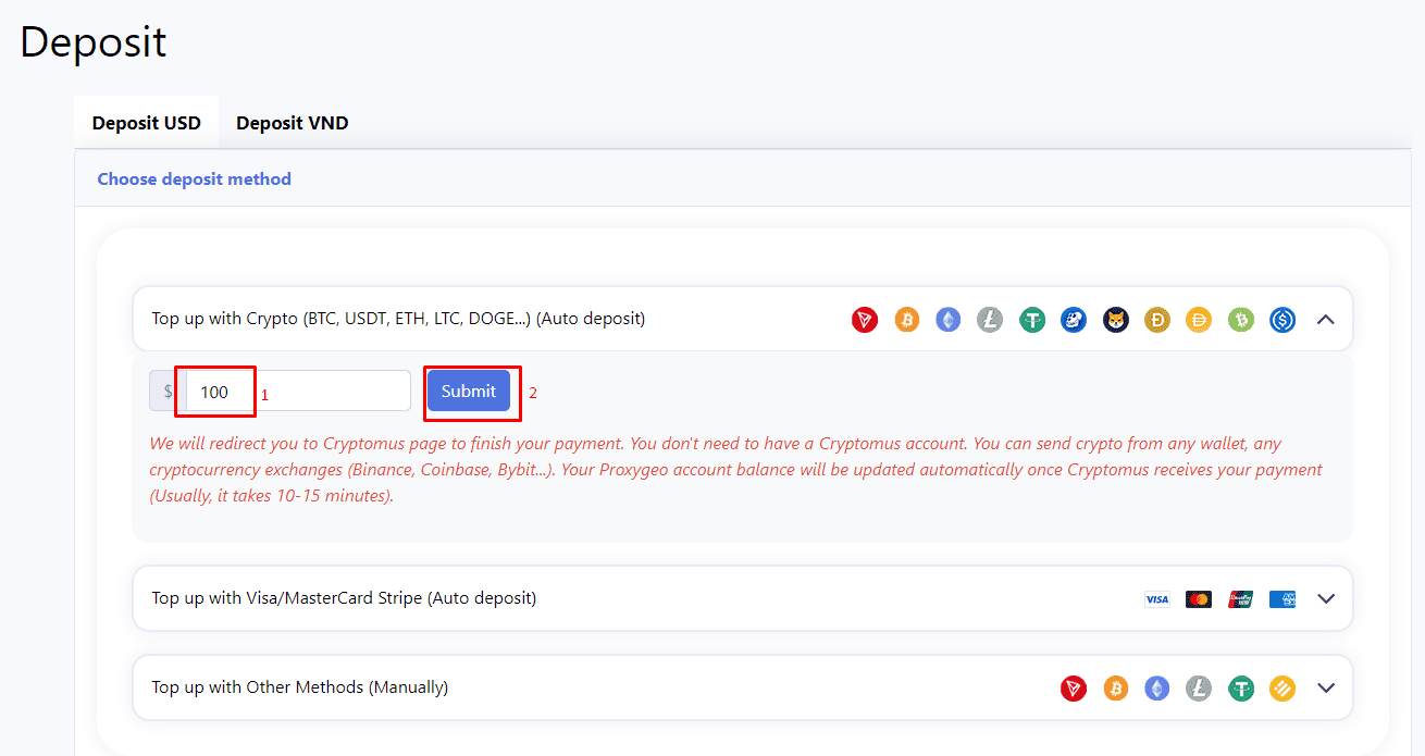 Then, you can see different methods to deposit your Proxygeo wallet