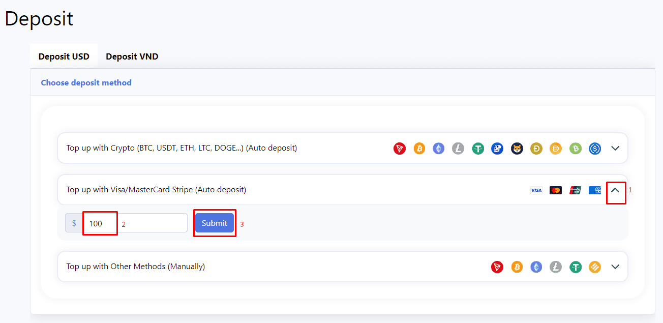 Next, you enter the amount (USD) that you want to deposit into $ section => click Submit